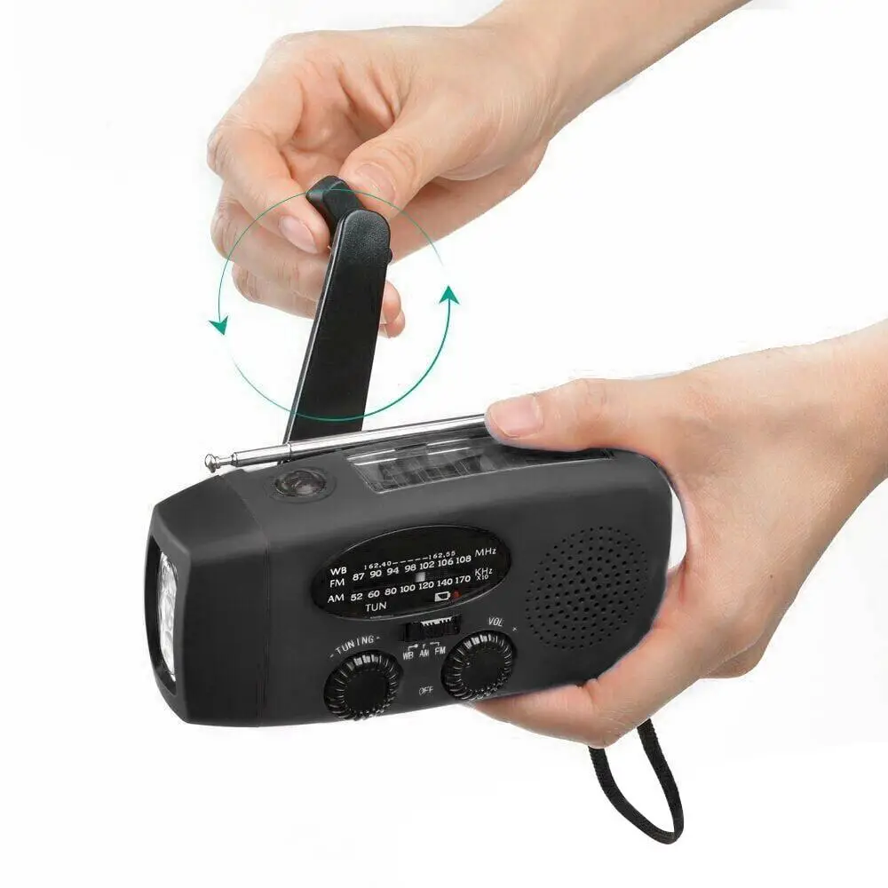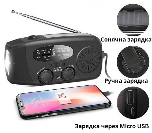 Заряджається Без Розеток: Ручна Динамо-зарядка та Сонячна панель гарантують, що пристрій ніколи не розрядиться, і вам не потрібно пам'ятати про кабелі.