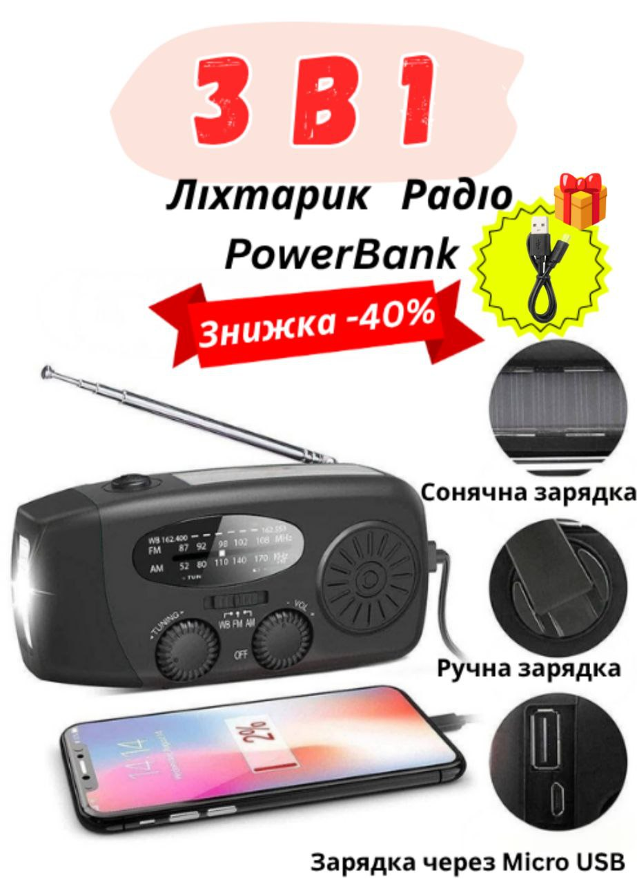 Аварійне Радіо 3-в-1 — це мультифункціональний пристрій для забезпечення автономності, який поєднує ліхтарик, радіоприймач та PowerBank (2000 мАг).